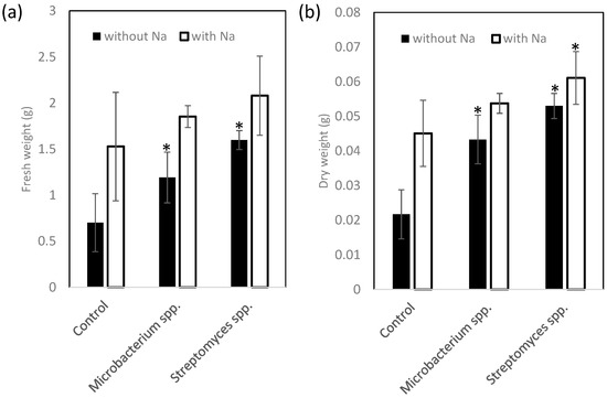 Effect of Streptomyces spp. strains 2 and Microbacterium spp. strain 4 on growth of ice plants in the control (no NaCl) and under 200 mM NaCl. (a) Fresh weight and (b) dry weight of whole plant. Closed bar indicates 0 mM NaCl, open bar indicates 200 mM NaCl. Values are mean ± standard deviation (n = 3–6). * Indicates a significant difference between a treatment and control (Dunnett’s test, p < 0.05).