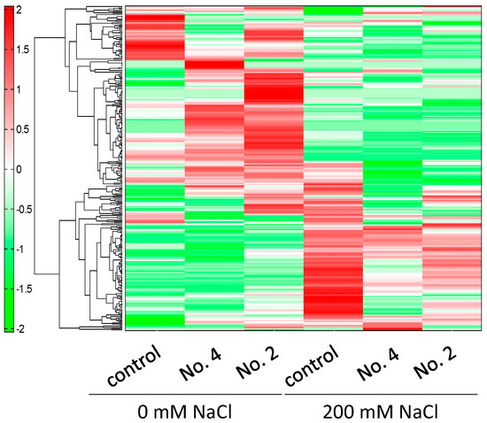 Heatmap of major metabolite groups based on comparative ratio in plants inoculated with strain 4 or strain 2 compared with mock-inoculated plants (a); and in plants inoculated with strain 4 or strain 2 compared with mock-inoculated plants under saline conditions (b). Green (low) to red (high) represents the increase in relative area of each peak among the three treatments.