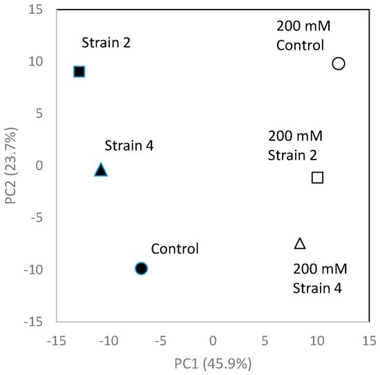 Scaling principal component analysis (PCA) based on metabolites detected in ice plants grown with/without NaCl and inoculation with strain 2 or strain 4 or mock inoculation. Open symbol and closed symbol indicate 200 mM and 0 mM NaCl, respectively. All samples and annotated metabolites were included in the PCA.