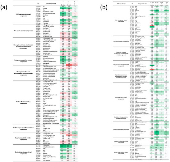 Next, CE-TOFMS analyses of common ice plant were carried out in cation and anion modes. In this study, analysis of substances registered in the HMT Metabolite Library and the Known–Unknown Peak Library was conducted. We detected 281 metabolites (166 cationic and 115 anionic). Selected data are shown in Figure 5, Figure 6 and Figure 7. The relative peak area of all observed metabolites differed among the three treatments. Of the 281 metabolites, 49.5% and 68.3% were more abundant in ice plants grown with strain 4 and strain 2, respectively, than in control plants. Of all the metabolites, 27.8% were more abundant in plants grown with one strain but less abundant in plants grown with the other strain, compared with the control; 16.4% were less abundant in plants grown with PGPE strains than in the control; 13.2% were not detected in the control, but only in plants grown with one of the PGPE; and 2.1% were detected in the control, but not in the plants grown with PGPE. We also detected differences in metabolite profiles between control plants and those under salinity stress. Of the 281 metabolites, 54.4% were more abundant in salt-stressed plants than in control plants; 6.8% were more abundant in plants grown with one PGPE strain and less abundant in plants grown with the other PGPE strain, compared with uninoculated plants under salinity stress; and 47% were less abundant in plants grown with PGPE than in mock-inoculated plants under salinity stress. A principal component analysis (PCA) score plot constructed from CE-TOFMS data separated the treatments into two distinct groups with respect to salinity (with/without NaCl) and three distinct groups with respect to PGPE (stain 2, strain 4, and no PGPE) on PC 1 (45.9%) and PC 2 (23.7%) (Figure 6). The factor loadings within each principal component of the PCA suggested the explanatory factors: the values of N1-acetylspermine, guanosine, lysine, and proline increased under salt treatment, while the values of inosine, GDP-mannose, GDP-glucose, O-acetylhomoserine-1, and ethanolamine phosphate decreased under salt treatment. Glycerol was extracted as an explanatory factor for PC2. Its value was lower in plants grown with strains 2 and 4 than in mock-inoculated plants under non-saline conditions, but was higher in plants grown with strains 2 or 4 than in mock-inoculated plants under saline conditions. Compared with mock-inoculated plants, ice plants grown with strains 2 and 4 showed increased contents of 2-oxoglutaric acid, acetyl CoA_divalent, citric acid, fumaric acid, isocitric acid, malic acid, succinic acid, and cis-aconitic acid, which are involved in the TCA cycle. In particular, fumaric acid was more abundant in plants grown with strain 2 than in those grown with strain 4. The abundance of ADP, ATP, and NADP+, which are important for photosynthesis and oxidative phosphorylation, was 1.5 times higher in plants grown with strain 2 than in mock-inoculated plants. Plants grown with strain 2 and those grown with strain 4 showed increased contents of 3-phosphoglyceric acid, malic acid, and sedoheptulose 7-phosphate, which are important for carbon fixation. Plants grown with strain 2 also showed increased contents of phosphoenolpyruvic acid and ribose 5-phosphate. The abundance of UDP-glucose, which is required for synthesizing sucrose as the energy source for plants, was 1.7 times higher in plants grown with strain 2 than in mock-inoculated plants. Plants grown with strain 2 also showed increased contents of 2-oxoglutaric acid, 3-phosphoglyceric acid, acetyl CoA_divalent, citric acid, glyceric acid, glycolic acid, glyoxylic acid, isocitric acid, malic acid, succinic acid, and cis-aconitic acid. These results suggested that strain 2 activated the glyoxylic acid pathway in ice plants, possibly to derive glucose as an energy source. Compared with plants under control conditions, those grown under salinity stress (200 mM NaCl) showed increased contents of ABC transporter–related compounds, proline, and spermine.