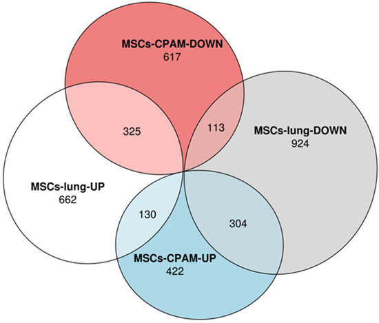 Distribution of differentially expressed genes (DEGs) in MSCs-lung or in MSCs-CPAM conditions. The Euler diagram shows how up and downregulated DEGs were distributed in MSCs-lung or in MSCs-CPAM after SARS-CoV-2 exposure. Particularly, the deregulation followed the same trend for 438 DEGs (130 were upregulated and 113 were downregulated). Conversely, 304 DEGs were downregulated in MSCs-lung and upregulated in MSCs-CPAM, and the opposite trend is observed for 325 DEGs.
