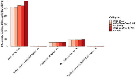 Reactome pathways in which the genes expressed in MSCs-lung or in MSCs-CPAM before and after SARS-CoV-2 exposure, MSCs-TA are expressed. For each experimental group, the plot shows the amount of genes included in the pathway. “Immune system” stands for “cytokine signaling in immune system” while “regulation of cell cycle” is “regulation of mitotic cell cycle” pathways. No differences were highlighted in “influenza virus-induced apoptosis” and in “replication of the SARS-CoV-2 genome”. Limited differences were instead observed in the other pathways.