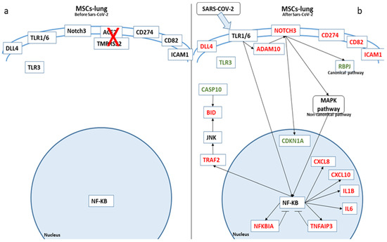 Biological representation of genes involved in Notch signaling before (a) and after (b) SARS-CoV-2 exposure in MSCs-lung. We observed the differences in MSCs-lung before and after SARS-CoV-2 exposure. The arrows show the biological activation of the genes. The genes represented in red are upregulated in MSCs-lung after SARS-CoV-2 exposure. Conversely, the genes in green are downregulated. Whereby the genes are depicted in black, no statistical difference was observed.
