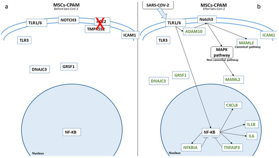 Biological representation of genes involved in Notch signaling before (a) and after (b) SARS-CoV-2 in MSCs-CPAM. We observed the differences in MSCs-CPAM before and after SARS-CoV-2 contact. The arrows show the biological activation of the genes. The genes in green are downregulated. Whereby, for genes depicted in black, no statistical difference was observed.