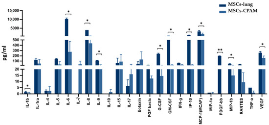 Cytokines and chemokines release in the secretome of SARS-CoV-2 exposed MSCs-lung and MSCs-CPAM 72 hpi. The levels of several proinflammatory cytokines and chemokines, assessed by multiplex ELISA, were significantly higher in MSCs-lung compared to MSCs-CPAM following viral exposure. The mean values of the two patients ± SE are reported for MSCs-lung and MSCs-CPAM. * = p < 0.05, ** = p < 0.01.