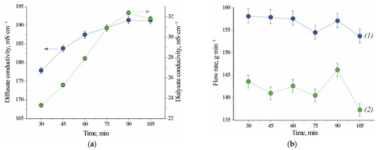 Conductivity (a) and flow rate (b) as a function of time for Test 1.1. (1) diffusate; (2) dialysate. Initial fill: water. Note that the lines connecting experimental points are not true trendlines.