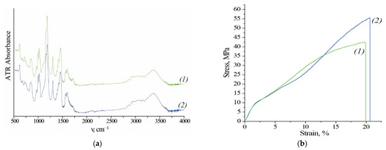 (a) Fourier transform infrared spectroscopy (FT-IR) spectra and (b) stress-strain curves for membranes (1) before use (initial state) and (2) after use (in a dry state, Cl− form).