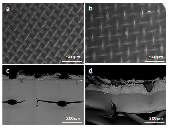 Scanning electron microscopy images detailing membrane state before use ((a) surface, (c) cross-section)) and after use ((b) surface, (d) cross-section).