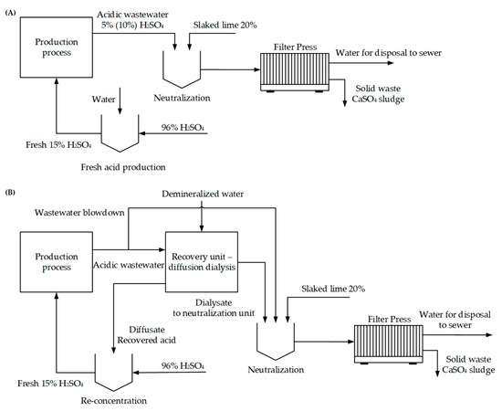 The following study deals with expenses and savings before and after implementation of the spiral-wound diffusion dialyzers into a generic plant consuming 15% H2SO4 and generating acidic waste. The study considers two cases of processing 90 kg·h−1 acidic wastewater at various degrees of dilution (5% and 10%) by dialysis. Re-concentration to 15% H2SO4 is also considered. The treatment section consists of neutralization by 20% suspension of slaked lime (technical-grade purity, 90%) according to a scheme shown in Figure 5A,B.