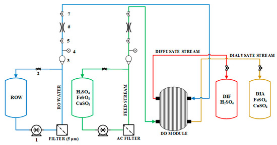 The experimental process consists of two parts, a hydraulic feed and diffusate and dialysate outlet streams (Figure 7). The hydraulic part consists of two Flojet pumps (Xylem Inc., USA), two filters (a 5 µm filter for the RO permeate and an activated carbon (AC) filter for the acidic feed stream) and a series of rotameters, pressure indicators and MARIC flow control valves (Maric Flow Control, Australia). Manual needle valves were located in the recirculation pipes to allow fine regulation of pressure and volumetric flow. High temperature levels (30 °C and 40 °C) were maintained in the feed solution by indirectly heating the salty acid barrel with a heating belt.