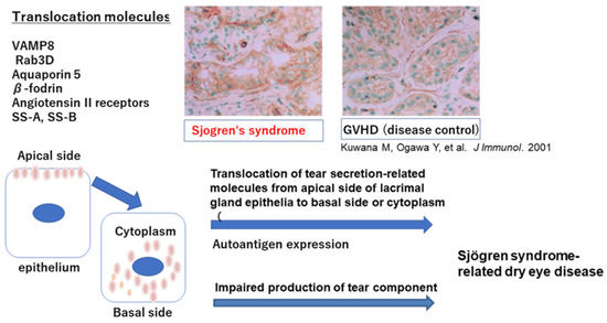 Vesicle associated molecular protein 8, Rab3D, aquaporin 5, β-fodrin, and angiotensin II type 2 receptor are translocated from apical membrane to cytoplasma or basal side of lacrimal gland epithelia, resulting in dysregulated production of tear component and loss of tear secretion leads to severe dry eye disease in Sjogren’s syndrome (SS). SS-A and SS-B antigens are also reported to be translocated in SS epithelia.