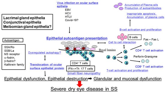 The pathophysiology of Sjogren’s syndrome related dry eye disease may be initiated by autoimmune epithelitis in the lacrimal gland, conjunctiva and possibly meibomian gland epithelia. Viral infection including Epstein Barr Virus (EBV), Hepatitis C virus (HCV), or Human T cell leukemia virus (HTLV)-1 are possible candidates to initiate the abnormal expression of various autoantigens including Sjogren’s syndrome antigen type A (SSA/Ro), Sjogren’s syndrome antigen type B (SSB/La), M3 muscarinic acetylcholine receptor (M3R), or α-fodrin with HLA-DR, adhesion molecules, and co-stimulatory molecules in the ocular surface and lacrimal gland epithelia. Translocation of various proteins related to tear component secretion may be influenced by dysregulated autophagy in SS. On the other hand, it is suggested that CD8+ T cells also play an important role to destroy the epithelia. In long-term follow-up of SS patients, there is accumulation of plasma cells in the stroma, leading to ocular surface epithelium dysfunction, resulting in severe dry eye disease. Proposed by Sumida T, et al. with some modification [119].
