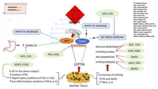 The purpose of this review is to summarize the effects of EOs in reducing/preventing obesity or in obesity-related diseases, such as metabolic syndrome (Figure 1). We will also highlight the effect of EOs on the microbiota, considering that the dysbiosis can contribute to a pathological state associated with obesity [9,10,11].