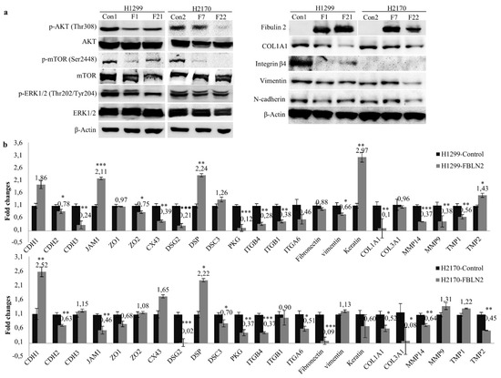 Additionally, upregulation of the tight-junction-associated gene JAM; the desmosomal gene DSP; keratin, one of the ECM scaffold molecules; and the ECM associated gene TMP2, and downregulation of the adherent-junction molecule CDH2, the tight-junction-associated gene ZO2, the gap-junction-related gene CX43, the desmosomal gene PKG, the cell adhesion receptor ITGB4 and the ECM components COL1A1 as well as the ECM-associated genes MMP14, MMP9, and TMP1, were found after FBLN2 transfection in H1299 cells (Figure 4b, top). In H2170 cells, the mRNA expression of the adherent junction molecule CDH1 and desmosomal gene DSP was significantly enhanced, while the desmosomal genes DSG2, DSC3, and PKG, and the cell adhesion receptors ITGB4 and ITGA6, as well as ECM genes such as fibronectin, COL1A1, COL3A1, MMP14, and TMP2 were markedly decreased in FBLN2-transfected cells compared to mock cells (Figure 4b, bottom). The distinct gene expression pattern between the ADC and SCC cells may have been related to the different cell context.