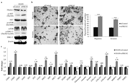 Effect of siRNA knockdown of FBLN2 on MAPK and AKT pathways and lung cancer cell migration/invasion. (a) Left: Downregulation of FBLN2 by siRNA-FBLN2 led to enhanced phosphorylation levels of ERK and AKT. (b) FBLN2 knockdown increased the cell migration/invasion. (c) FBLN2 gene silencing influenced the expression levels of cell adhesion and ECM genes, as revealed by real-time RT-PCR. mRNA expression level compared to GAPDH in cells transfected with siRNA-Control was set to 1.0. * p < 0.05, ** p < 0.01, *** p < 0.001.