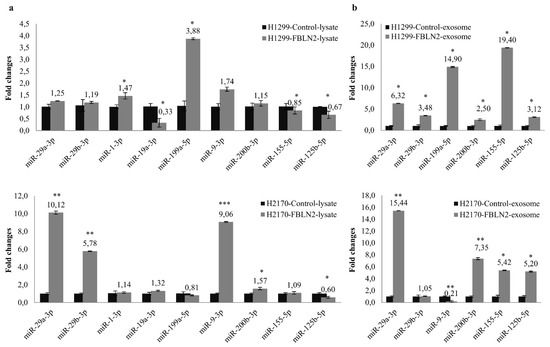 Effect of FBLN2 on both cell lysate and exosome-derived miRNAs. (a) Nine miRNAs were widely expressed in cell lysates of both H1299 and H2170 cells, but in different expression patterns. Compared to mock transfectants, miR-29a-3p, miR-29b-3p, miR-9-3p, miR-200b-3p, and miR-125b-5p were highly expressed in H2170 FBLN2 transfectants, while miR-1-3p, miR-199-5p, miR-125b-5p, and miR-21-5p were upregulated in H1299 transfectants. miRNA expression level normalized to U6 in the mock cells was set to 1.0. * p < 0.05, ** p < 0.01, *** p < 0.001. (b) In the analysis of exosome-derived miRNA, FBLN2 overexpression upregulated the expression of miR-29a-3p, miR-200b-3p, miR-155b-5p, and miR-125b-5p in both cell lines, and the expression of miR-29b-3p and miR-21-5p in H1299. miRNA expression level normalized to cel-miR-39 in the mock cells was set to 1.0., * p < 0.05, ** p < 0.01.