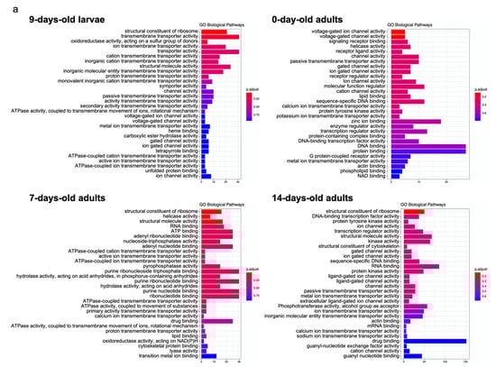 To understand the significance and network connection of differentially expressed terms/pathways, overrepresentation analysis was performed for GO biological pathways of upregulated and downregulated DEGs for 9-day-old larvae and 0-, 7-, and 14-day-old adults among different concentrations of imidacloprid treatments (Figure 1a,b). For 9-day-old larvae, upregulated DEGs were enriched in the structural constituents of the ribosome and transmembrane transporter activity among different concentrations of imidacloprid treatment, while those of 0-, 7-, and 14-day-old adults were voltage-gated ion channel activity (0-day), structural molecule activity (7-day), structural constituent of ribosome (7-and 14-day), and helicase activity (7-day) (Figure 1a). Downregulated DEGs enriched in 9-day-old larvae were related to guanyl-nucleotide exchange factor activity, protein kinase activity, calcium ion binding, and protein serine/threonine kinase activity, while those of 0-, 7-, and 14-day-old adults were enriched in oxidoreductase activity (0-day), sequence-specific DNA binding (7-day), structural constituent of the cuticle (7-day), nuclease activity (14-day), and isomerase activity (14-day) (Figure 1b). The top 10 enriched GO pathways are shown in Supplementary Figure S1a (upregulated),b (downregulated).