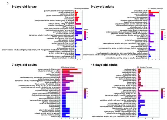 GO biological pathways of (a) upregulated and (b) downregulated DEGs among different imidacloprid treatments of 9-day-old larvae, 0-day-old adults, 7-day-old adults, and 14-day-old adults. X-axis: number of genes; Y-axis: GO terms; p.adjust: the adjusted p value of identified GO terms; bar color from red to blue represents the adjusted p value from low to high.