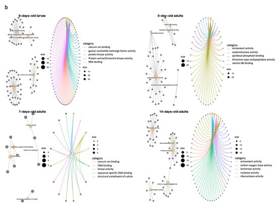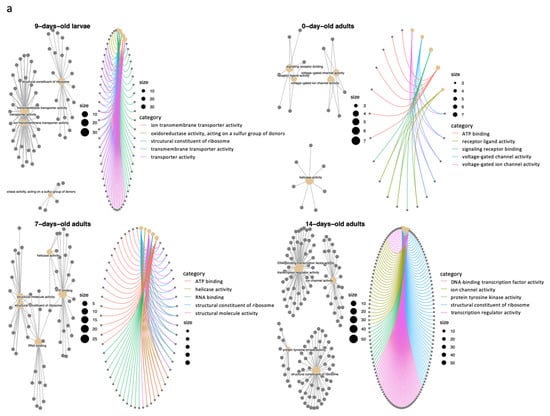 Gene-pathway concept network for overrepresentation testing for GO terms in the pool of (a). upregulated and (b). downregulated DEGs among different imidacloprid treatments in 9-day-old larvae, 0-day-old adults, 7-day-old adults, and 14-day-old adults. Size: number of DEGs; category: the GO terms category. Gray lines indicate the network connection, and the weight of the line reflects the degree of connection between terms. Colored lines indicate the connection between terms and the involved genes. The concept network plot shows that the genes are involved in significant terms and biological complexness.
