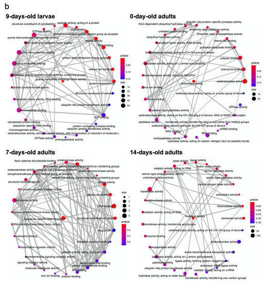 Enrichment maps for overrepresentation testing for GO terms in the pool of (a) upregulated and (b) downregulated DEGs among different imidacloprid treatments in 9-day-old larvae, 0-day-old adults, 7-day-old adults, and 14-day-old adults. Size: number of DEGs; p value: the p value of identified GO terms. The color from red to blue represents the p value from low to high. Gray lines indicate the network connection, and the weight of the line reflects the degree of connection between terms.