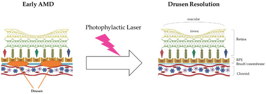 Prophylactic laser therapy is similar to photocoagulation therapy. They both involve resolving drusen using laser treatment. The mechanism of drusen resolution by laser treatment is very simple, as laser beams have enough energy (heat) to burn drusen (Figure 1).
