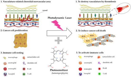 The mechanisms of photodynamic therapy. Photodynamic therapy generates reactive oxygen species (ROS) and destroys photosensitizer-binding fast proliferative cells, such as choroidal neovascularization (CNV) cells related to AMD via thrombosis and cancer cells through ROS synthesis, and stimulates immune cells’ activation.
