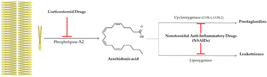 Nonsteroidal anti-inflammatory drugs (NSAIDs) inhibit the synthesis of prostaglandins (PGEs) via inactivating cycloxygenase-1 (COX-1) or cycloxygenase-2 (COX-2), and they have been used as anti-inflammatory and antipyretic agents and analgesic drugs [78] (Figure 3). They are used as topical applicants for various ophthalmological purposes—for example, as an inflammation suppressor against allergic conjunctivitis and keratitis, a down-regulator for cystoid macular edema, a contractor for cataract surgery, etc. [79]. Aspirin is a famous NSAID, but although a low aspirin dose has been found to not affect AMD occurrence [73,74], a high aspirin dose might decrease AMD prevalence [75]. Nepafenac is a potent NSAID prodrug that has higher vascular permeability, longer inhibition of PGE synthesis, and better corneal penetration than others [76]. Intravitreal diclofenac and ketorolac injections have been found to effectively control inflammation in a lipopolysaccharide (LPS)-induced ocular inflammation rabbit model [77].
