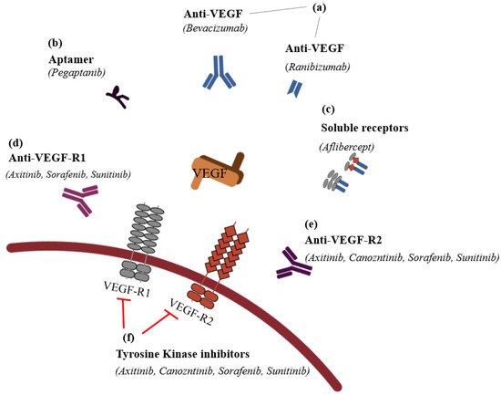 It is possible to classify the inhibitors into six groups: (1) VEGF antibodies (humanized ones, such as bevacizumab (AvastinTM), or fragment of humanized ones, such as ranibizumab (LucentisTM)); (2) aptamers (oligonucleotides such as PegaptanibTM); (3) soluble receptors (aflibercept (EyleaTM)); (4) anti-VEGF-R1; (5) anti-VEGF-R2; and (6) VEGFR tyrosine kinase inhibitors, such as imatinib mesylate, sorafenib, sunitinib, and vatalanib in CNV (Figure 4).