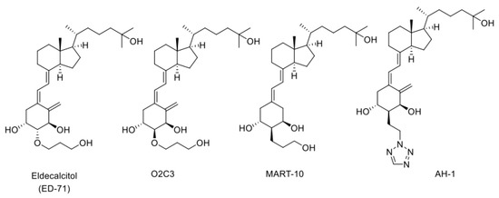- Suhara, Y.; Nihei, K.I.; Tanigawa, H.; Fujishima, T.; Konno, K.; Nakagawa, K.; Okano, T.; Takayama, H. Syntheses and biological evaluation of novel 2alpha-substituted 1alpha,25-dihydroxyvitamin D3 analogues. Bioorg. Med. Chem. Lett. 2000, 10, 1129–1132. [Google Scholar] [CrossRef]