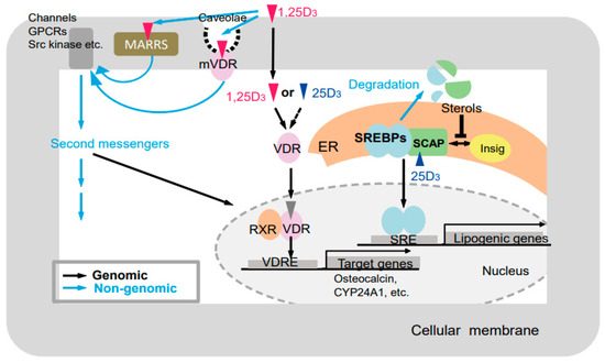 - Asano, L.; Watanabe, M.; Ryoden, Y.; Usuda, K.; Yamaguchi, T.; Khambu, B.; Takashima, M.; Sato, S.I.; Sakai, J.; Nagasawa, K.; et al. Vitamin D Metabolite, 25-Hydroxyvitamin D, Regulates Lipid Metabolism by Inducing Degradation of SREBP/SCAP. Cell Chem. Biol. 2017, 24, 207–217. [Google Scholar] [CrossRef] [PubMed] [Green Version]