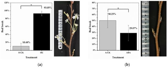 Bud break rate of P. pyrifolia “Huanghua” after 21 days of treatment. (a) The bud break rate of endodormant pear floral buds at 21 days after HC and water (H-CK) treatments. The photo on the right shows the floral bud breakage under HC treatment. (b) The bud break rate of ecodormant pear floral buds at 21 days after ABA and water (A-CK) treatments. The photo on the right shows growth arrest of floral buds under ABA treatment. Forty-five shoots from each treatment were selected for bud break tests. Data are presented as the mean ± standard error of three biological replicates; and * indicate significant differences (p < 0.05, Tukey’s test) between samples.