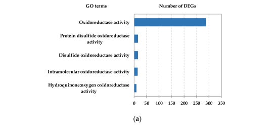 The HC-induced DEGs in this study were submitted to OmicShare online tools (www.omicshare.com/tools, accessed on 4 April 2020) for GO term and KEGG enrichment analysis. Pear background files of GO terms and KEGG pathways were obtained from the GDR database (The Genome Database for Rosaceae, https://www.rosaceae.org, accessed on 6 April 2020) []. The calculated p-value was subjected to FDR correction, taking FDR ≤ 0.05 as a threshold. GO terms and KEGG pathways meeting this condition were defined as significantly enriched GO terms and KEGG pathways.