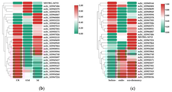 Forty-five shoots each cultured in cold storage for 15 days, 30 days, and 45 days were collected, and placed in water in vials in a phytotron (kept under conditions of day/night: 14 h/10 h, temperature: 25 ± 1/20 ± 1 °C relative humidity 75%). The base of the shoot was trimmed, and the water in the vials was changed every 3–5 days. After 21 days, the percentage of bud breakage was determined to evaluate the dormancy status (Figure S7). Green leaf tips enclosing visible flowers were used as a sign of bud breakage []. Lateral floral buds of shoots after 21 days of cultivation with bud break rates ≥ 50% were defined as being in the endodormancy release stage [].