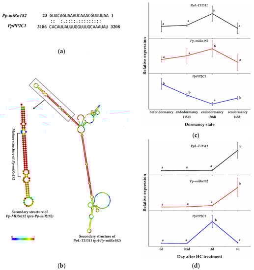 Prediction of the interaction between Pp-miRn182 and PpPP2C1. (a) Cleavage site mapping of the Pp-miRn182 target gene PpPP2C1. (b) The predicted secondary structure of the PpL-T31511 (pri-Pp-miRn182) and pre-Pp-miRn182 (Pp-MIRn182) sequences. (c) The relative expression of PpL-T31511, Pp-miRn182 and PpPP2C1 during the dormancy process in pear floral buds. (d) The relative expression of PpL-T31511, Pp-miRn182 and PpPP2C1 in pear floral buds treated with HC. Data are presented as the mean ± standard error of three biological replicates; different letters indicate significant differences (p < 0.05, Tukey’s test) between samples.