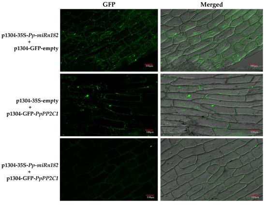 We constructed p1304-35S-PpL-T31511 and p1304-GFP-PpPP2C1 vectors. The expression of Pp-miRn182 was successfully detected in Nicotiana benthamiana leaves overexpressing PpL-T31511, but not in wild Nicotiana benthamiana leaves. We co-infected these two plasmids into onion epidermal cells using the transient transfection assay and detected the fluorescence intensity of the GFP-PpPP2C1 fusion protein. Confocal microscopic examination revealed lower green fluorescence signals of the GFP-PpPP2C1 fusion protein in onion epidermis cells with p1304-35S-PpL-T31511 overexpression than in onion epidermis cells with p1304-35S-empty (control vectors) (Figure 4). This result indicated that the lncRNA PpL-T31511-drived Pp-miRn182 inhibits the expression of the GFP-PpPP2C1 fusion protein. Next, the expression patterns of PpPP2C1, Pp-miRn182 and PpL-T31511 in pear floral buds were analyzed. The expression of PpPP2C1 appeared to increase during endodormancy release, and it could also be induced by HC treatment for 3 days (Figure 3c,d). The expression trends of Pp-miRn182 and PpL-T31511 were completely opposite from that of PpPP2C1, which was in line with the predicted relationship among them. These results suggested that PpL-T31511-derived Pp-miRn182 targets PpPP2C1 directly.