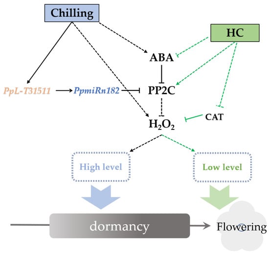 Proposed model of PpL-T31511-derived Pp-miRn182 involvement in the PP2C-H2O2 pathway in pear endodormant floral buds under HC treatment. Arrows indicate a promoting interaction; T-ends indicate an inhibiting interaction. Dashed lines denote an indirect interaction.