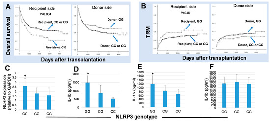 NLR family pyrin domain-containing 3 (NLRP3) genotypes influenced transplant outcomes after HSCT and also influenced IL-1β secretion in response to NLRP3 activation. The Kaplan–Meier analysis of the 5-year overall survival (OS) (A) and the transplant-related mortality rates (TRM) (B) after transplantation according to the recipient and donor NLRP3 genotypes. Recipients with the G/G genotype of NLRP3 at rs10754558 had the worst 5-year overall survival compared to those with the C/C or C/G genotypes (hazard ratio (HR), 1.86; 95% confidence interval (CI), 1.22–2.22; p = 0.004; higher TRM, HR, 2.28; 95% CI, 1.20–4.35; p = 0.01). (C) RNA extracted from peripheral blood mononuclear cells (PBMCs) of 24 healthy individuals were subjected to RT-PCR with TaqMan primers specific for the NLRP3 gene, and the analysis showed a significantly higher NLRP3 transcripts in individuals harboring the G/G genotypes in comparison to those with the C/C or C/G genotypes. Blood samples from 27 healthy individuals with the GG (n = 8), CG (n = 14), and CC (n = 5) genotypes of rs10754558 NLRP3 were subjected to a whole blood culture assay for 16 h in the presence or the absence of LPS (D), the NLRP3 ligand MDP (E), or PHA (F), and the levels of IL-1β released in the culture supernatant were determined by ELISA. * p < 0.05.