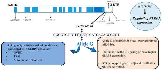 Interestingly, a recent study showed that the G/G genotype of rs10754558 was significantly associated with increased risk of developing septic shock compared to the controls, and mechanistic studies utilizing luciferase reporter vectors containing NLRP3 3′-UTR with the rs10754558 variation showed that the allele C had a higher affinity to miR-146a, a negative regulator of NLRP3 transcripts and, consequently, the allele C of rs10754558 was more sensitive to the suppressive effects of miR-146a than the allele G [75]. These results further validated the functional relevance of rs10754558 and established the molecular bases by which a genetic variant in the 3′-UTR of the NLRP3 gene regulates NLRP3 expression, where a gain-of-function alteration (allele G) augments the resistance of NLRP3 transcripts to the suppressive regulatory effects of miR-146a-5p (Figure 2).