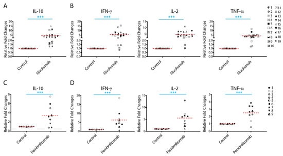 Treatment with nivolumab or pembrolizumab elicits potent interleukin-10 (IL-10) production from T cells. (A,B) Purified T cells were co-cultured with allogeneic matured monocyte-derived dendritic cells in the presence of nivolumab (20 μg/mL) for 5 days, after which the culture media was harvested for multiplex analysis of production of IL-10 (A(, and interferon-γ (IFN-γ), IL-2, and tumor necrosis factor-α (TNF-α) (B). (C,D) Purified T cells were co-cultured with allogeneic monocyte-derived dendritic cells in the presence of pembrolizumab (20 μg/mL) for 5 days, after which the culture media was harvested for multiplex analysis of the production of IL-10 (C) and IFN-γ, IL-2 and TNF-α (D). Graphs show the relative fold changes over the no-antibody treatment controls. Each symbol represents data from one individual donor pair. Note: The representative symbols between Figure 1A,B (nivolumab treatment group) and Figure 1C,D (pembrolizumab treatment group) are not the same. Student’s t-test, *** p < 0.001.