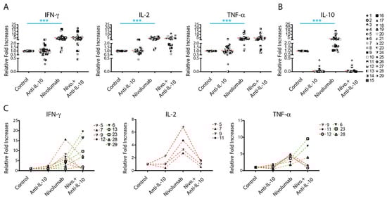 Anti-interleukin-10 (anti-IL-10) mAb induces heterogeneous cytokine responses. (A,B) Purified T cells were co-cultured with allogeneic matured monocyte-derived dendritic cells in the presence of nivolumab (20 μg/mL) with or without anti-IL-10 mAb (5 μg/mL) for 5 days, after which the culture media was harvested for multiplex analysis of the production of interferon-γ (IFN-γ), IL-2 and tumor necrosis factor-α (TNF-α), (A) and IL-10 (B). Graphics charting the relative fold change over the no-antibody treatment controls per donor pair. (C) Donor pairs with two-fold changes between nivolumab and nivolumab plus anti-IL10 mAb treatment are shown. Each symbol represents data from one individual donor pair. Student’s t-test, *** p < 0.001.