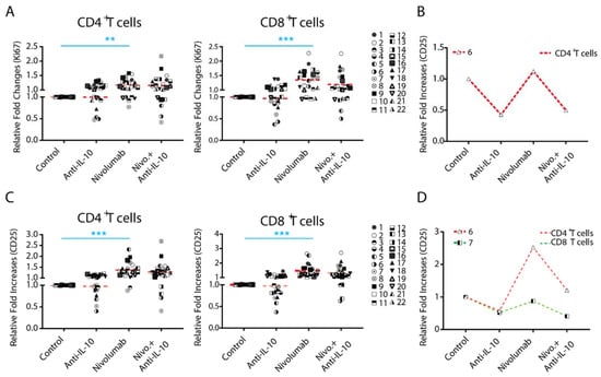 Anti-interleukin-10 (anti-IL-10) mAb induces heterogeneous expression of nuclear protein Ki67 (Ki67) and CD25 on CD4+ and CD8+ T cells. Purified T cells were co-cultured with allogeneic monocyte-derived dendritic cells in the presence of nivolumab (20 μg/mL) with or without anti-IL-10 mAb (5 μg/mL) for 5 days, after which cells were harvested for flow cytometry analysis of Ki67 expression. (A,B) Donor pairs showing that anti-IL-10 mAb decreased nivolumab-modulated expression of Ki67 in CD4+ and CD8+ T cells are shown (A). Donor pairs with two-fold changes between nivolumab and nivolumab plus anti-IL10 mAb treatment are shown (B). (C,D) Purified T cells were co-cultured with allogeneic monocyte-derived dendritic cells in the presence of nivolumab (20 μg/mL) with or without anti-IL-10 mAb (5 μg/mL) for 5 days, after which cells were harvested for flow cytometry analysis of CD25. Graphs show the relative fold change over the no-antibody treatment controls (C). Donor pairs showing that anti-IL-10 mAb decreased nivolumab-modulated expression of CD25 in CD4+ and CD8+ T cells are shown (D). Each symbol represents data from one individual donor pair. Student’s t-test, ** p < 0.01.*** p < 0.001.