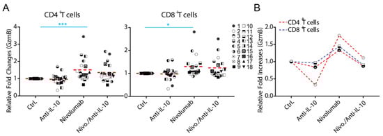 Anti-interleukin-10 (anti-IL-10) mAb induces heterogeneous expression of Granzyme B (GzmB) in CD4+ and CD8+ T cells. (A,B) Purified T cells were co-cultured with allogeneic monocyte-derived dendritic cells in the presence of nivolumab (20 μg/mL) with or without anti-IL-10 mAb (5 μg/mL) for 5 days, after which cells were harvested for flow cytometry analysis of Granzyme B expression. (A) Donor pairs showing that anti-IL-10 mAb decreased nivolumab-modulated expression of Granzyme B in CD4+ and CD8+ T cells are shown. Graphs show the relative fold change over the no-antibody treatment controls. (B) Donor pairs with two-fold changes between nivolumab and nivolumab plus anti-IL10 mAb treatment are shown. Each symbol represents data from an individual donor pair. Student’s t-test, * p < 0.05, *** p < 0.001.