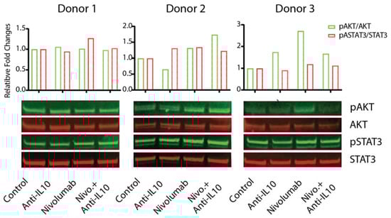 Anti-interleukin-10 (anti-IL-10) and nivolumab differentially affect activation of the AKT and signal transducer and activator of transcription 3 (STAT3) signaling pathways. Purified T cells were co-cultured with allogeneic monocyte-derived dendritic cells in the presence of nivolumab (20 μg/mL) with or without anti-IL-10 mAb (5 μg/mL) for 5 days, after which cells were harvested for WB analyses to determine activation of the AKT and STAT3 signaling pathways. Total AKT and total STAT3 were used as loading controls. Upper panel is the quantitative data of the Western blot results as conducted using ImageJ software. The activation of the AKT and STAT3 pathways is determined by the band intensity of pAKT (or pSTAT3) relative to the band intensity of total AKT (or STAT3). Data are from three donors, representative of at least eleven donor pairs.