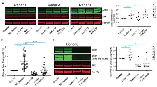 Together, our data indicate that anti-IL-10 and/or nivolumab activates the MAPK pathway in a donor-dependent manner and that nivolumab-induced IL-10 production depends on activation of the MAPK pathway.