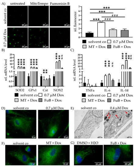 Mitochondrial Homeostasis—Mitochondrial ROS Production, Inflammation and Structure. (A) Mitochondrial ROS production was visualized with MitoSOX (green) and measured with cLSM. Pictures depict six representative images of three independent measurements. (B) mRNA expression levels of ROS scavenger (SOD2, GPx1, Cat) and inducer (NOX2). (C) mRNA expression levels of inflammatory cytokines (TNFα, IL-6, IL-1β). (D) Mitochondrial structure visualized with MitoTracker (green) and cLSM. Nucleus was stained blue. (E) Electron microscopy of cells treated with solvent co and 0.4 µM at 20,000× magnification. Red arrows indicate multilamellar bodies. Black arrow highlights an early autophagosome encapsulating a mitochondrion. White arrows show physiological tube-like mitochondria. (F) Cells were pre-treated with MT and subsequently treated with Dox. Mitochondrial structure visualized with MitoTracker (green) and cLSM. Nucleus was stained blue. Pre-treatment shows less impaired mitochondrial structure but no complete reversion to solvent co. (G) Cells were pre-treated with FuB and subsequently treated with Dox. Mitochondrial structure visualized with MitoTracker (green) and cLSM. Nucleus was stained blue. Pre-treatment with FuB restored some of the physiological net-like mitochondrial structure. Depicted are mean values and standard deviation of minimum 3 biological replicates. Significances were calculated with a t-test. (**/## p ≤ 0.01, ***/### p ≤ 0.001).