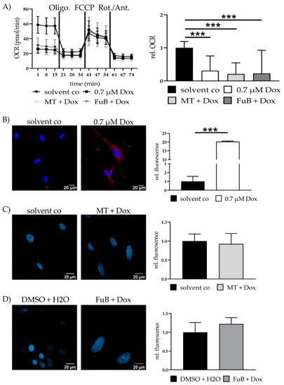 Mitochondrial activity and cell survival—Metabolic function and apoptosis. (A) Mitochondrial ATP production measured with Seahorse Analysis. Depictured is one representative measurement. (B) Cytochrome c delocalization from mitochondria to cytoplasm visualized with IF. Cytochrome c was stained red. Nucleus was stained blue. Shown are two representative images. (C) Cells were pre-treated with MT followed by Dox. Cytochrome c was stained red. Nucleus was stained blue Shown are two representative images. (D) Cells were pre-treated with FuB followed by Dox. Cytochrome c was stained red. Nucleus was stained blue. Shown are two representative images. Depicted are mean values and standard deviation of minimum three biological replicates. Significances were calculated with a t-test. (*** p ≤ 0.001).