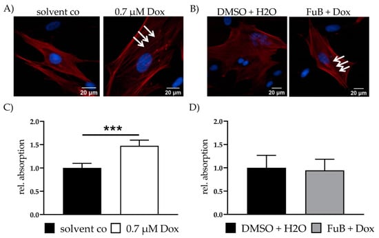 Fibrosis—ACTA2 expression and collagen production. (A) Fibrosis marker ACTA2 was visualized with IF. ACTA2 was stained red. Nucleus was stained blue. Dox treated cells show more defined ACTA2 filaments (white arrows). (B) Fibrosis marker ACTA2 was visualized with IF. ACTA2 was stained red. Nucleus was stained blue. FuB + Dox treated cells still show more defined ACTA2 filaments (white arrows). (C) Collagen in the cell supernatant was measured after Dox treatment, followed by 72 h growth medium incubation. (D) Collagen in the cell supernatant was measured after FuB followed by Dox treatment and additional 72 h growth medium. Depicted are the mean values and standard deviation of minimum three biological replicates. Significances were calculated with a t-test. (*** p ≤ 0.001).