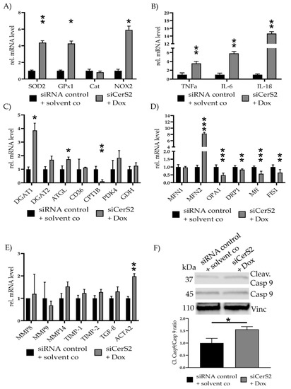 Fibrosis related gene expression showed increased tendencies, but none were significantly altered, except for ACTA2. ACTA2 was increased for siCerS2 + Dox (1.98 ± 0.12, p = 0.005) (Figure 6E). Cleav. Casp9/Casp9 ratio was still increased in siCerS2 + Dox (1.56 ± 0.11, p = 0.02) but the ratio was lower if directly compared to only Dox (Figure 6F).