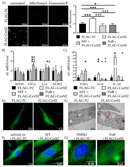 Mitochondrial Homeostasis—Inflammation and structure in FLAG-CerS2. (A) Mitochondrial ROS production was visualized with MitoSOX (green) and measured with cLSM. Pictures depict six representative images of three independent measurements. (B) mRNA expression levels of ROS scavenger (SOD2, GPx1, Cat) and inducer (NOX2). (C) mRNA expression levels of inflammatory cytokines (TNFα, IL-6, IL-1β). (D) Mitochondrial structure visualized with MitoTracker (green) and cLSM. Nucleus was stained blue. (E) Electron microscopies of cells of the FLAG-TC or FLAG-CerS2 condition at 20,000× magnification. Red arrows indicate multilamellar bodies. (F) Cells were pre-treated with MT and subsequently transfected. Mitochondrial structure visualized with MitoTracker (green) and cLSM. Nucleus was stained blue. Pre-treatment shows improved mitochondrial structure. (G) Cells were pre-treated with FuB and subsequently transfected. Mitochondrial structure visualized with MitoTracker (green) and cLSM. Nucleus was stained blue. Pre-treatment with FuB restored some of the physiological net-like mitochondrial structure. Depicted are mean values and standard deviation of minimum three biological replicates. Significances were calculated with a t-test. * = significant to FLAG-TC. # = significant to FLAG-CerS2. (*/# p ≤ 0.05, **/## p ≤ 0.01, ***/### p ≤ 0.001).