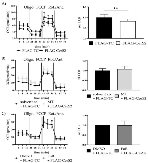 Mitochondrial Homeostasis—Metabolic function in FLAG-CerS2 determined with Seahorse Analysis. (A) Mitochondrial ATP production measured with Seahorse Analysis. Shown is one representative measurement. (B) Mitochondrial ATP production measured with Seahorse Analysis of FLAG-CerS2 hFSF pre-treated with MT. Shown is one representative measurement (C) Mitochondrial ATP production measured with Seahorse Analysis of FLAG-CerS2 hFSF pre-treated with FuB. Shown is one representative measurement. Depicted are mean values and standard deviation of minimum three biological replicates. Significances were calculated with a t-test. ** = significant to FLAG-TC. (** p ≤ 0.01).